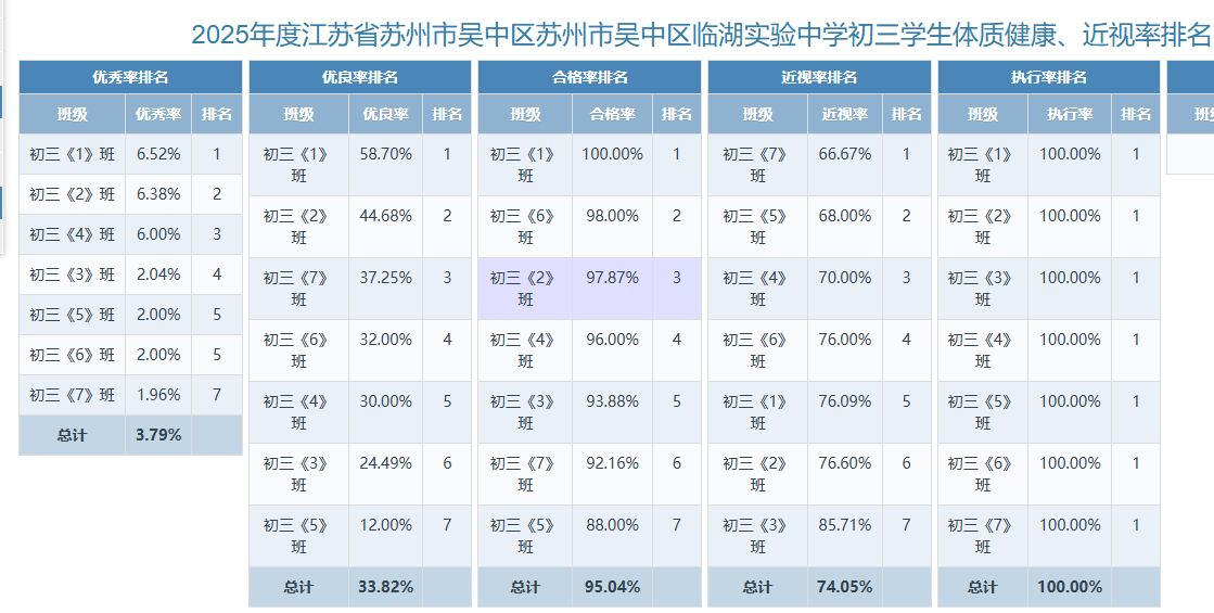 2025年度江苏省苏州市吴中区苏州市吴中区临湖实验中学学生体质健康、近视率排名